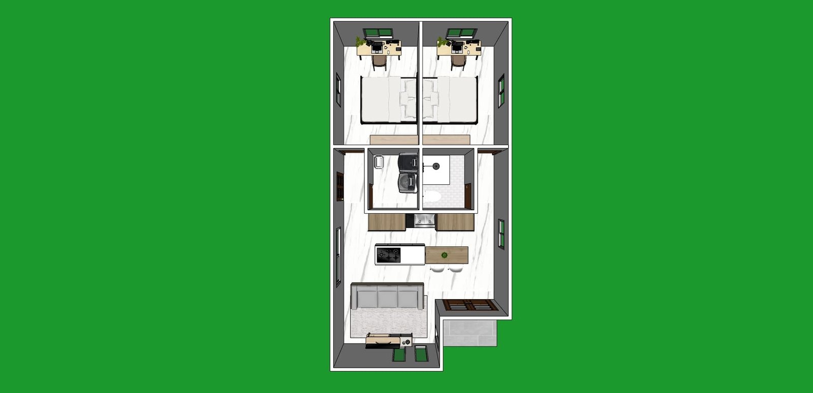 This beautiful one-bedroom home is constructed with durable 4" concrete blocks and features elegant PVC panel ceilings. The bathroom and toilet areas are tiled to a height of 1.80 meters, providing a sleek and modern finish. Complete with solid wood exterior doors and foreign model interior doors, the house is designed for both security and style. Clear glass sliding windows in various sizes allow natural light to flood the interior. The kitchen unit is 1.50 meters long, providing ample space for cooking. The entire living area is fully tiled, ensuring a polished look throughout.